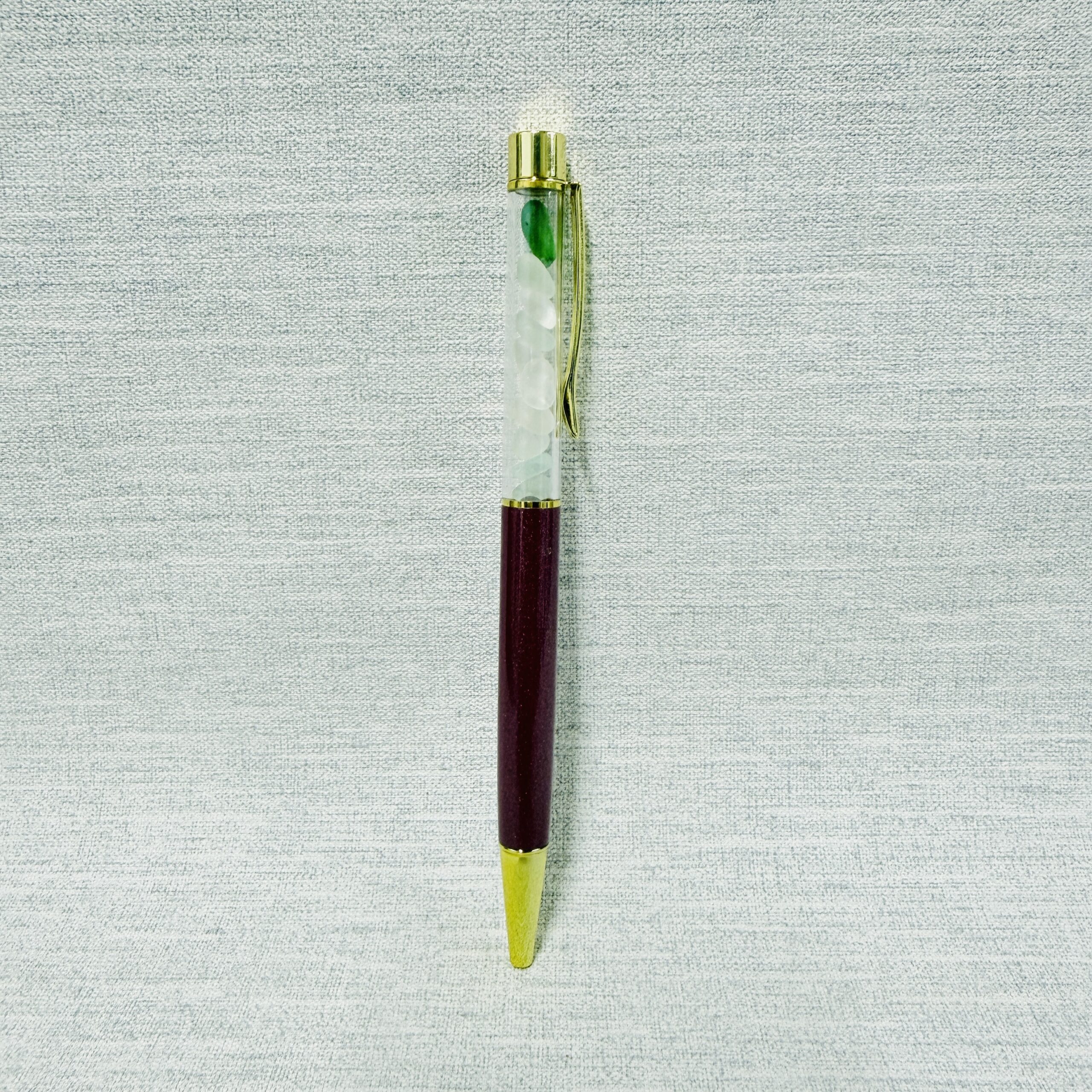 This metallic dark pink ballpoint pen is filled with genuine Manx sea glass, carefully collected from the beaches of the Isle of Man. Smoothed by the tide and shaped by time, the sea glass carries the story of the shore. This pen writes with smooth black ink for reliable, everyday use.
