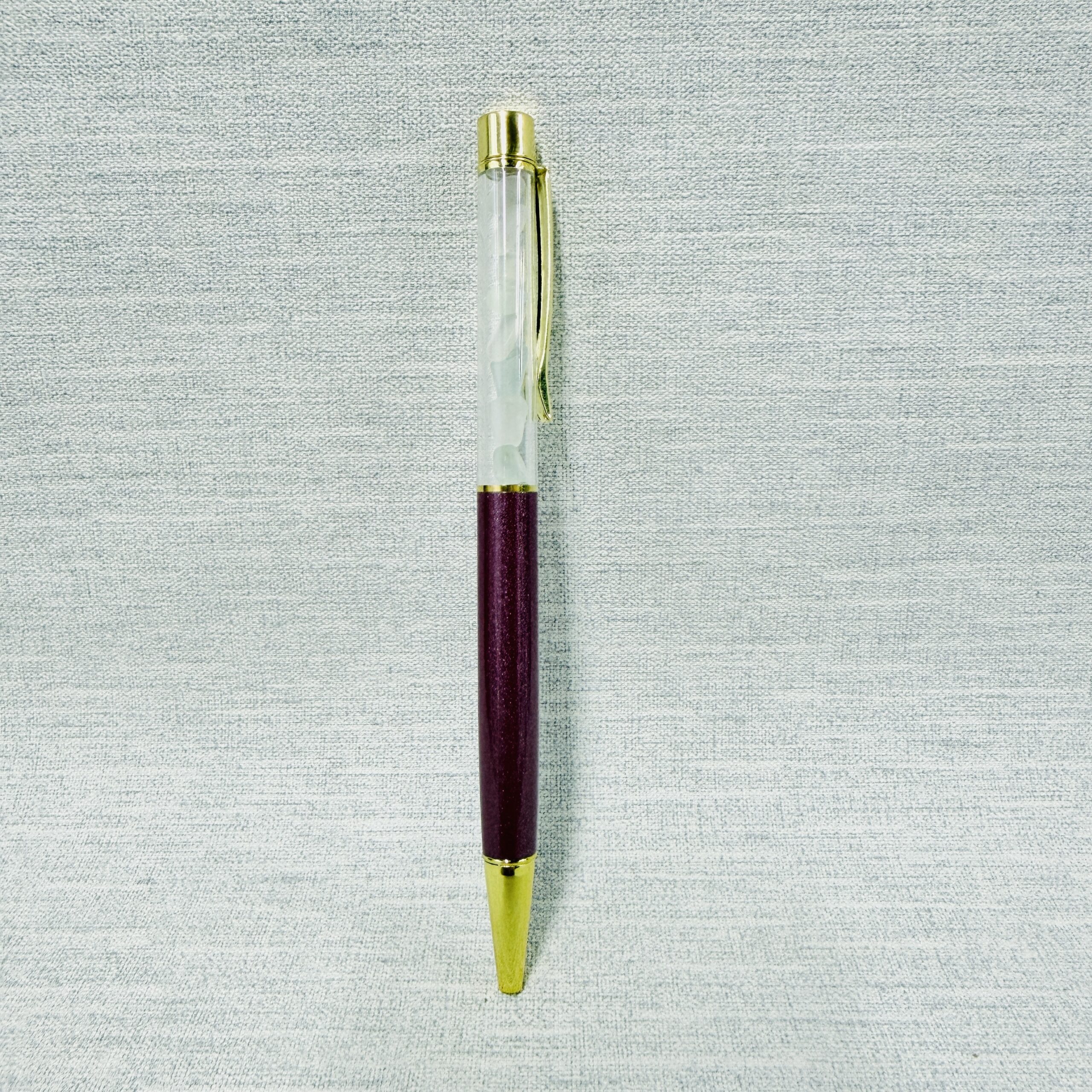This metallic dark pink ballpoint pen is filled with genuine Manx sea glass, carefully collected from the beaches of the Isle of Man. Smoothed by the tide and shaped by time, the sea glass carries the story of the shore. This pen writes with smooth black ink for reliable, everyday use.