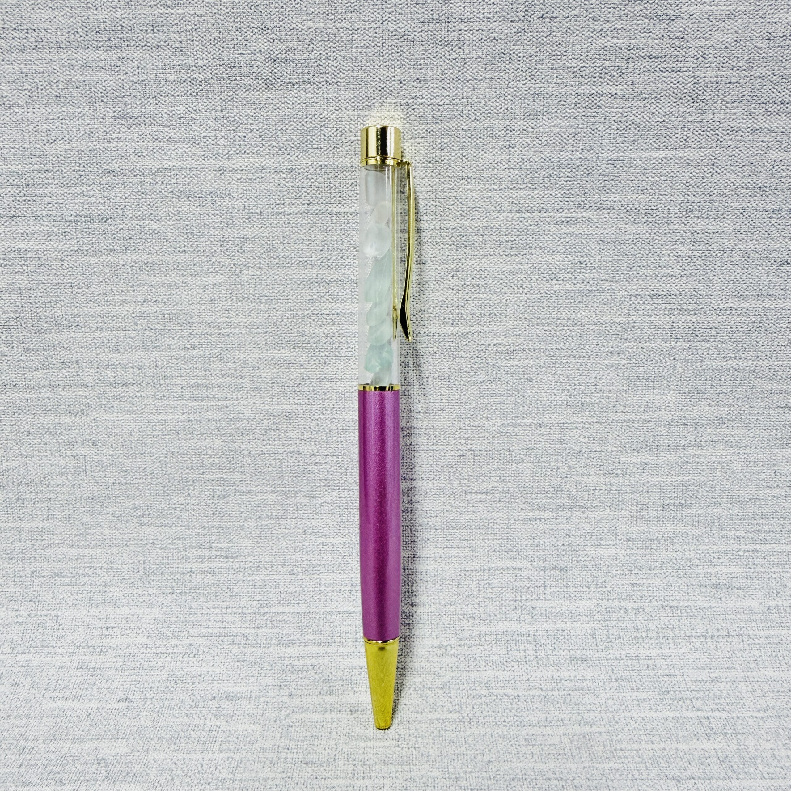 This metallic purple/pink ballpoint pen is filled with genuine Manx sea glass, carefully collected from the beaches of the Isle of Man. Smoothed by the tide and shaped by time, the sea glass carries the story of the shore. This pen writes with smooth black ink for reliable, everyday use.