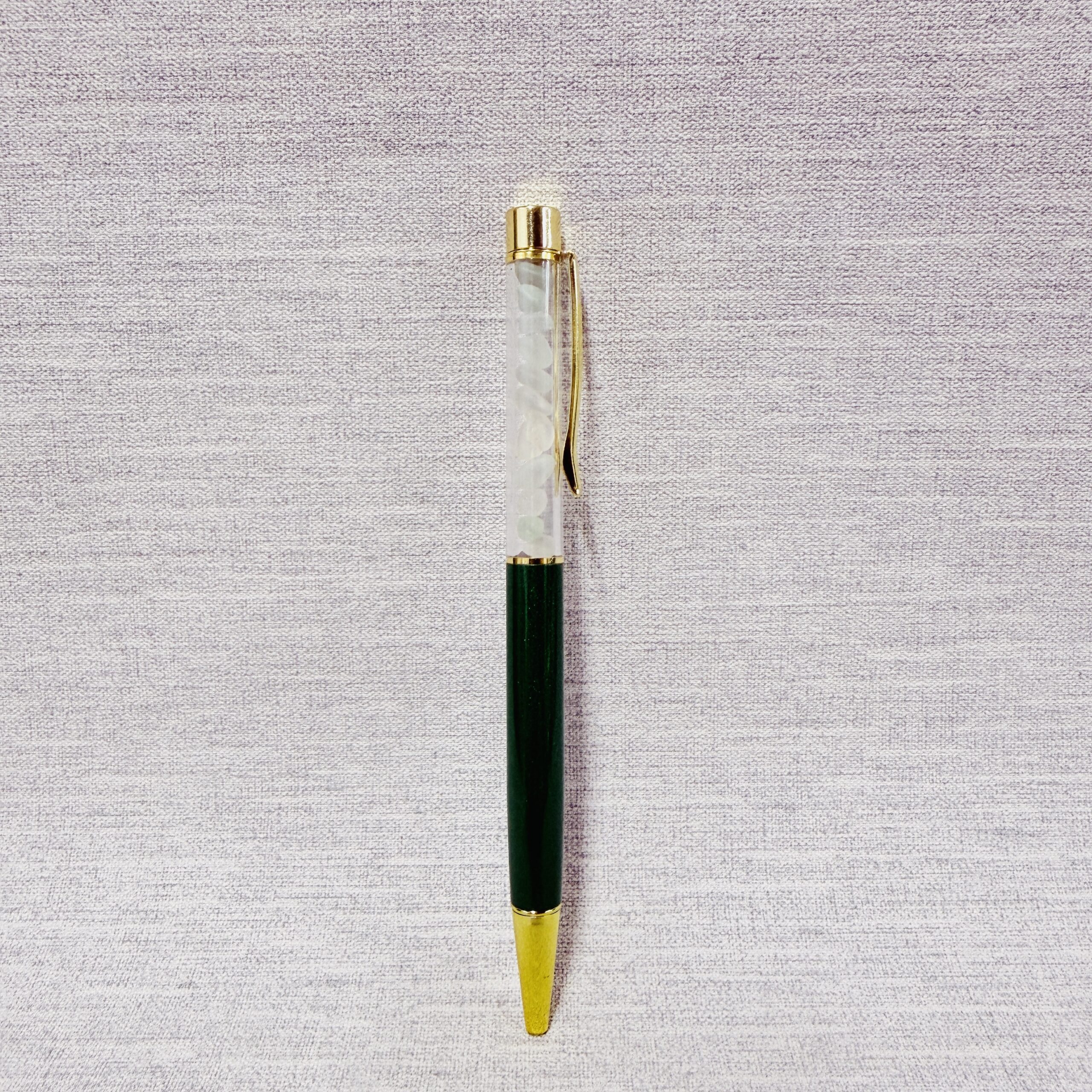This metallic bottle green ballpoint pen is filled with genuine Manx sea glass, carefully collected from the beaches of the Isle of Man. Smoothed by the tide and shaped by time, the sea glass carries the story of the shore. This pen writes with smooth black ink for reliable, everyday use.