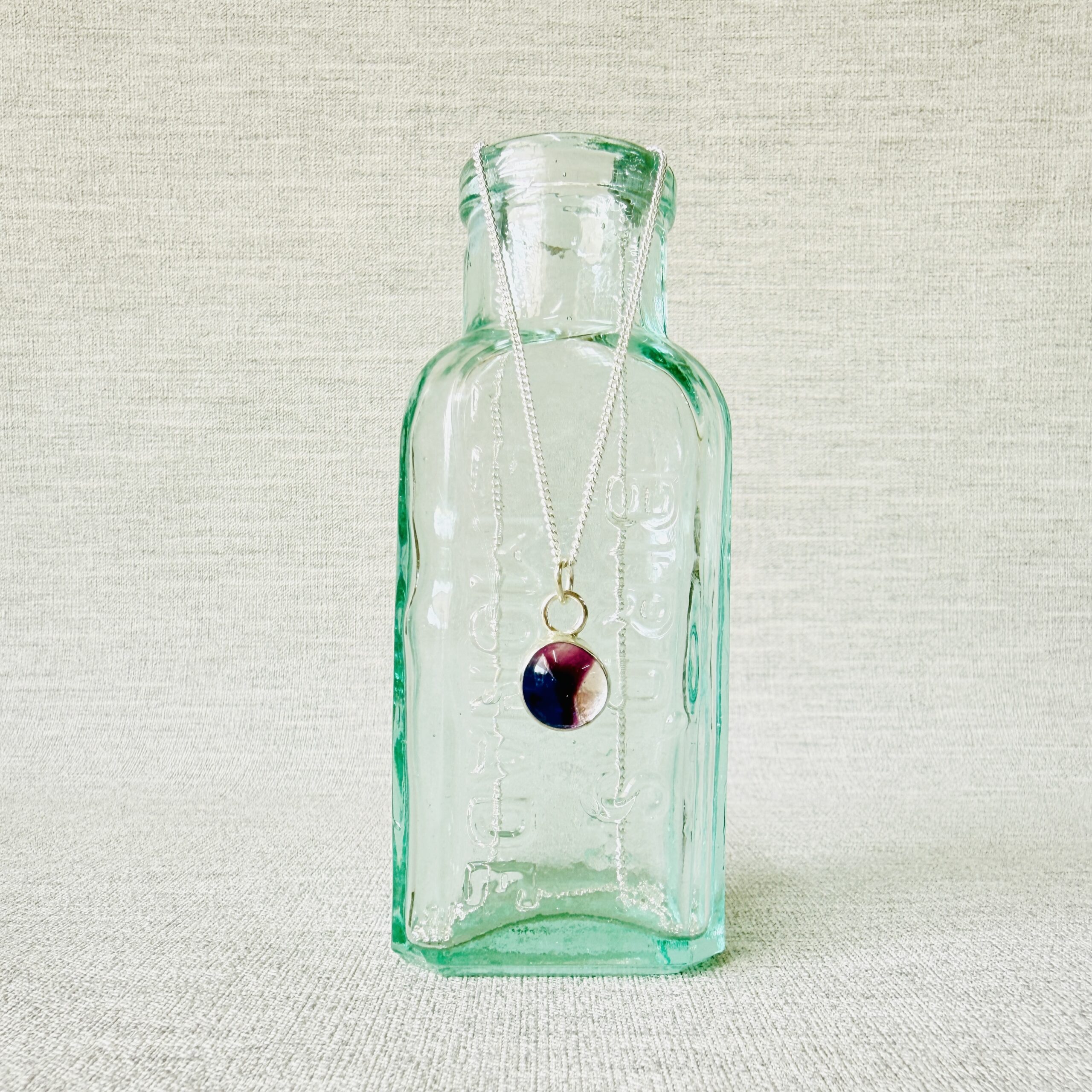 A beautiful necklace made with a piece of multicoloured glass cabochon. The glass has been set in a bezel setting.