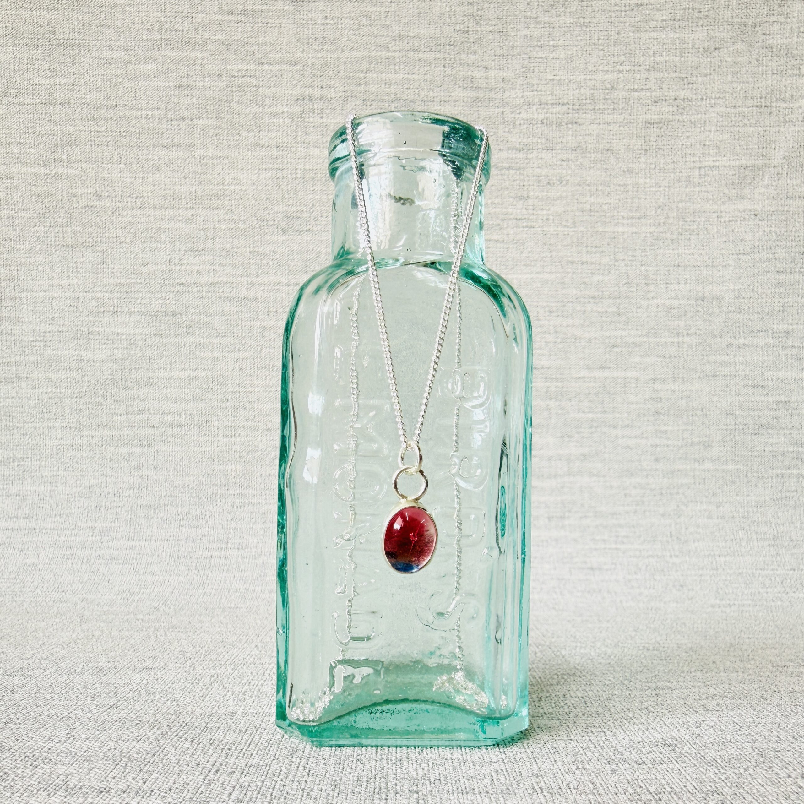 A beautiful necklace made with a piece of multicoloured glass cabochon. The glass has been set in a bezel setting.
