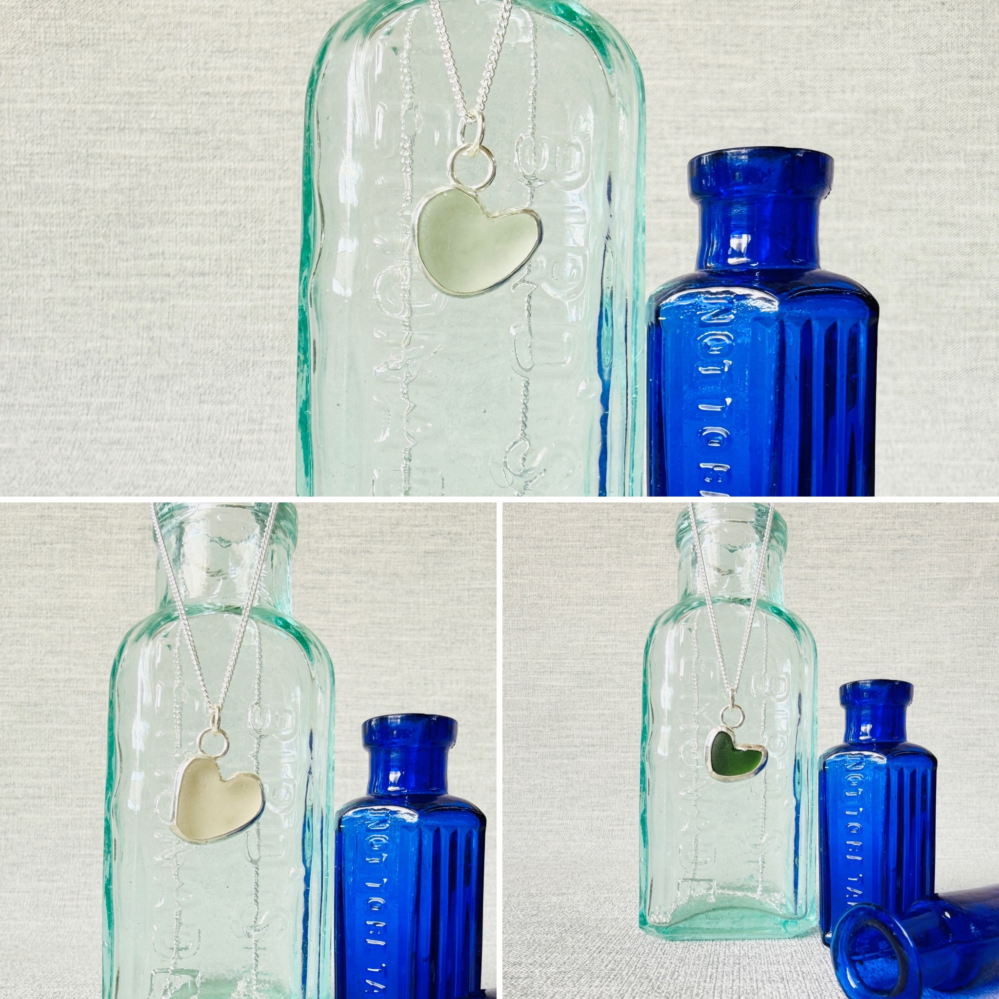 This heart necklace has been handmade using an authentic piece of green sea glass which has been created using a bezel setting.