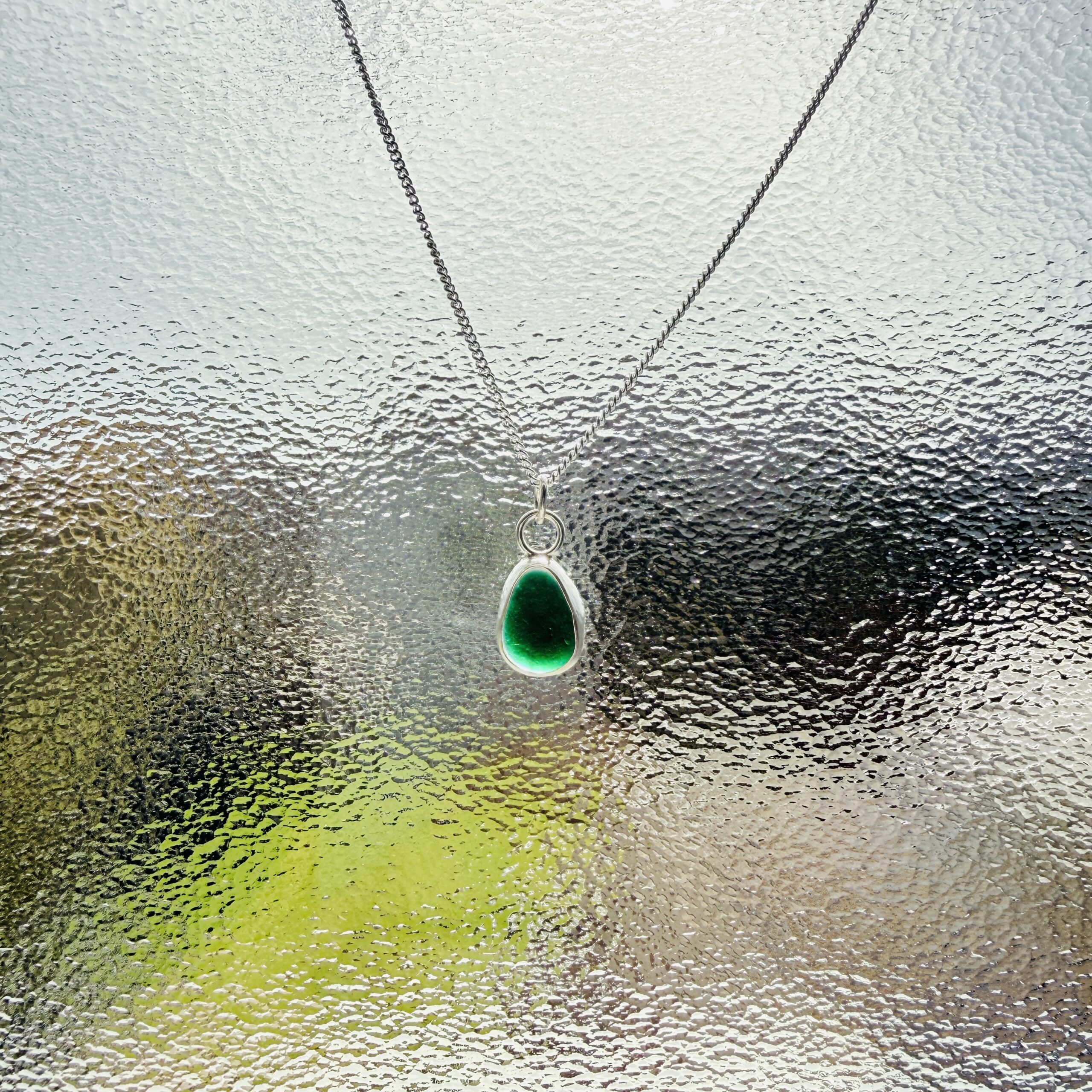 This necklace has been handmade using an authentic piece of deep green sea glass which has been created using a backless bezel setting. When light shines through the pendant it truly showcases the stunning colour of the piece of sea glass.