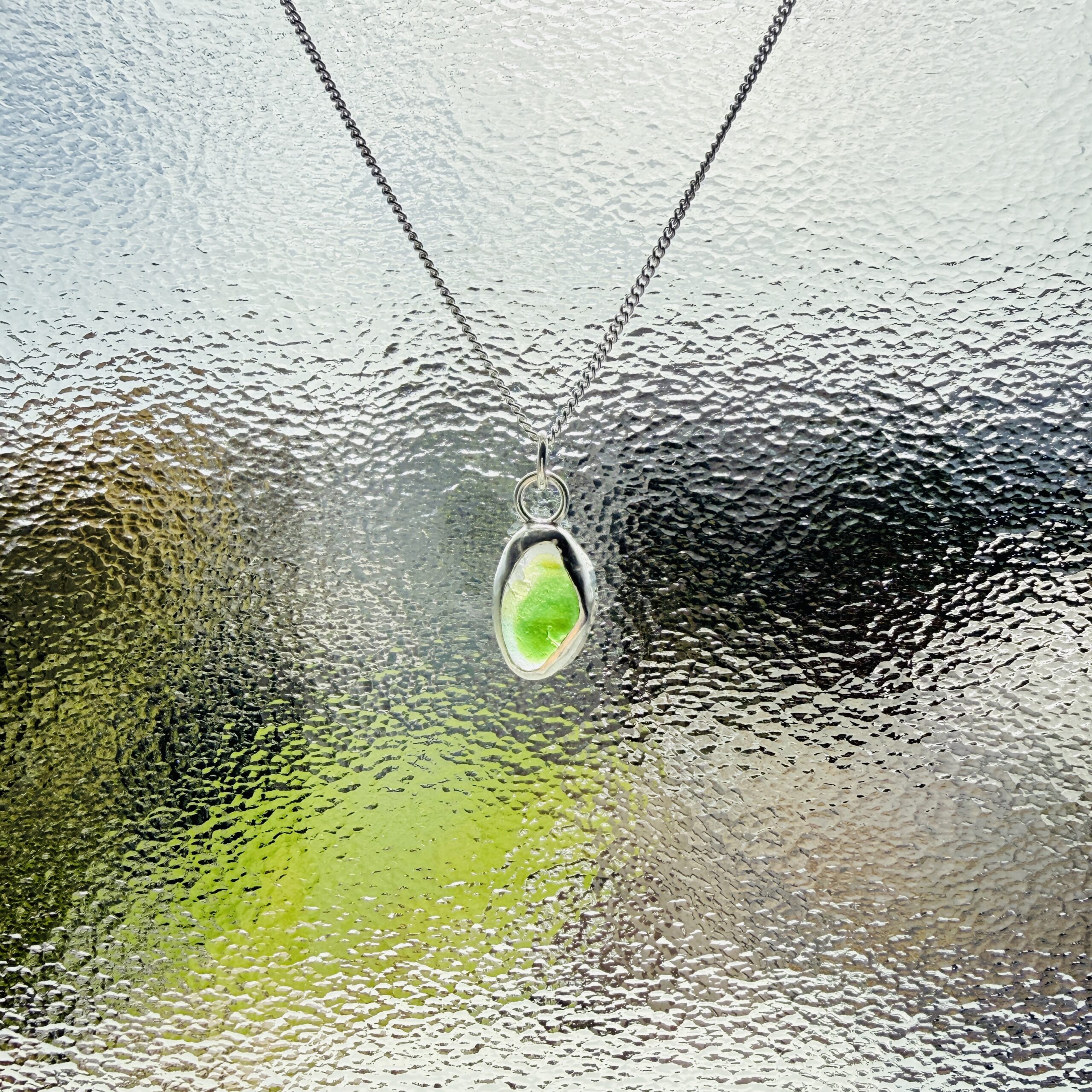 This necklace has been handmade using an authentic piece of green/white multi sea glass which has been created using a backless bezel setting. When light shines through the pendant it truly showcases the stunning colour of the piece of sea glass.