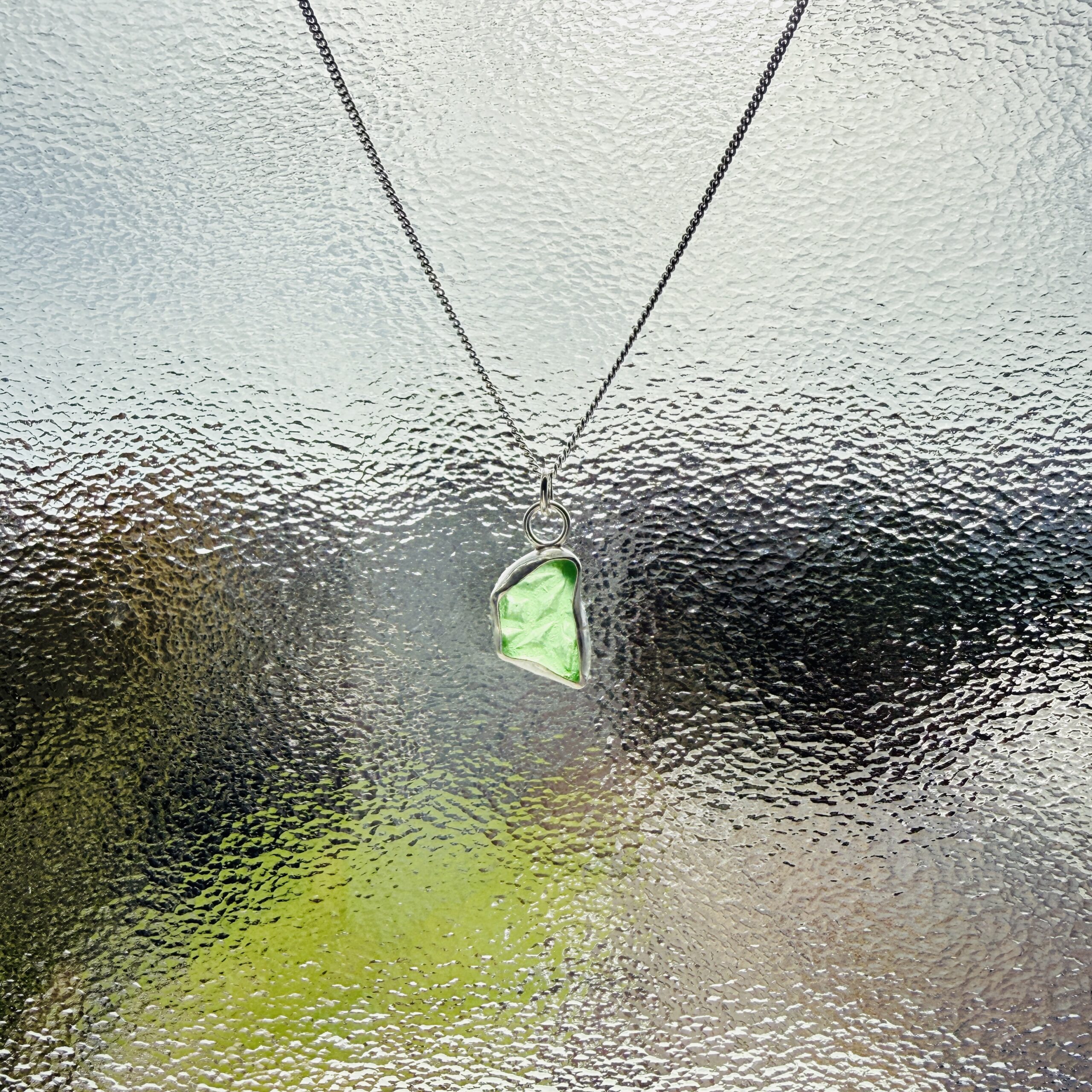 This necklace has been handmade using an authentic piece of green patterned sea glass which has been created using a backless bezel setting. When light shines through the pendant it truly showcases the stunning colour of the piece of sea glass.