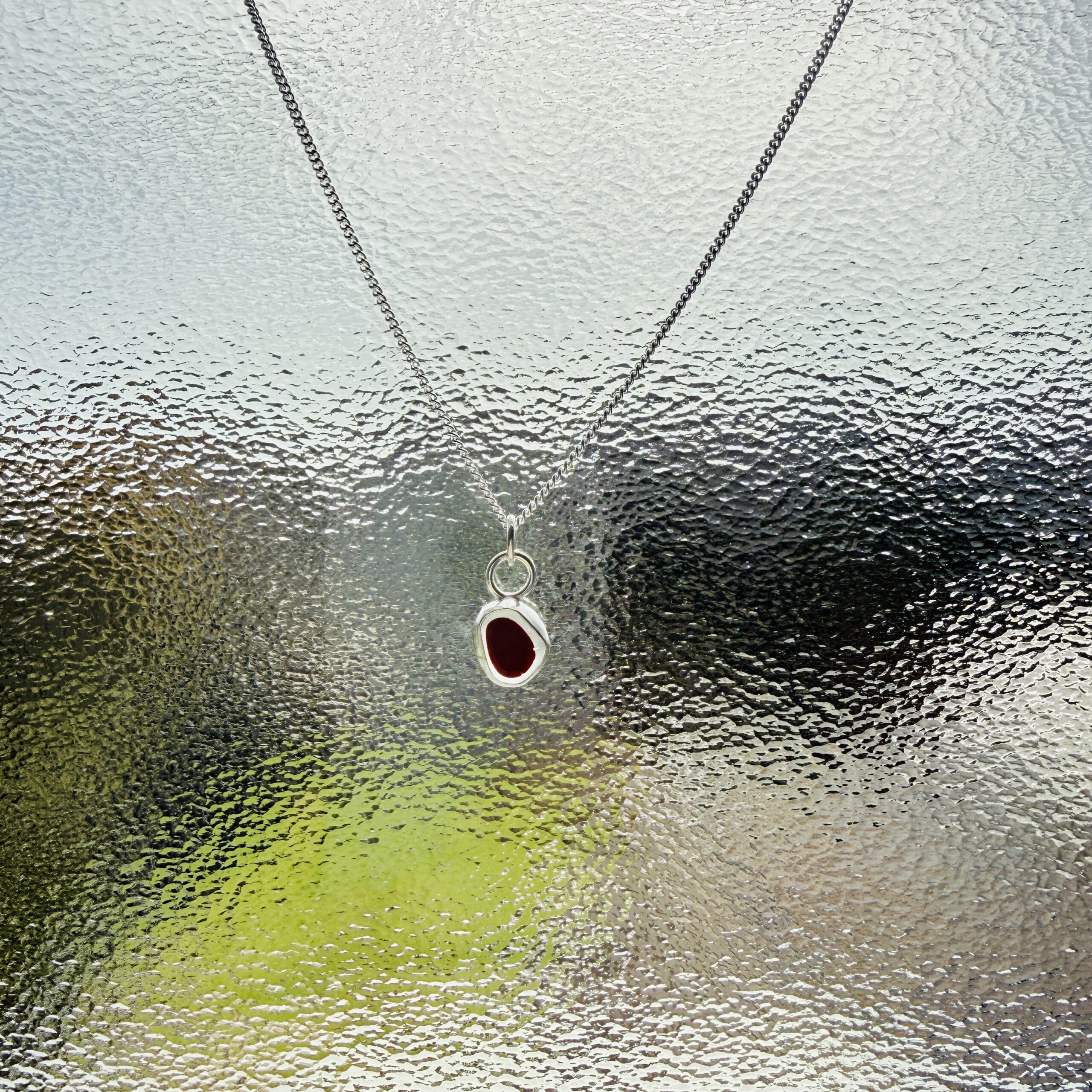 This necklace has been handmade using an authentic piece of deep red sea glass which has been created using a backless bezel setting. When light shines through the pendant it truly showcases the stunning colour of the piece of sea glass.